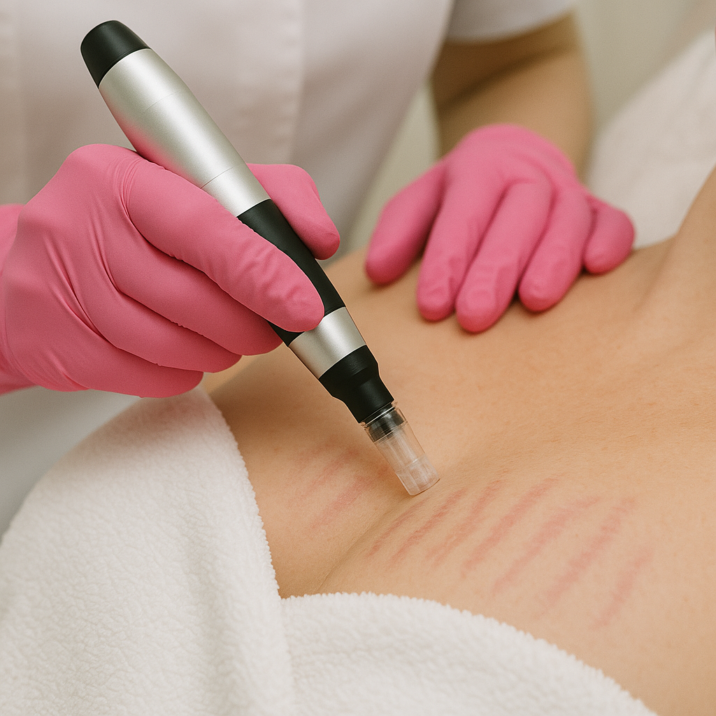 Regenerační ošetření pomocí dermapenu, které zlepšuje elasticitu, pevnost a hustotu pokožky. Mikrovpichy stimulují tvorbu kolagenu a elastinu, díky čemuž se strií postupně zjemňují, stahují a zarůstají novou zdravou tkání. více